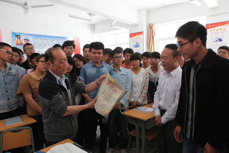 上午,窦铁成来到临渭校区铁成3142班,看望同学们。窦铁成的到来,令大家异常兴奋,争先恐后地向劳模汇报学习、生活情况。在听说同学们成绩优异,表现突出,并能利用课余时间开展各类技能、公益活动时,窦铁成十分高兴。他依次取出带有补丁、写着“安全生产”的书包、一把卷尺和一支笛子,送给铁成班的同学。窦铁成说,书包是自己做电工时使用的,上面的补丁是自己亲手缝补,希望同学们将“安全生产”永记心间;卷尺是他1986年在唐山做第一个项目时使用的,希望同学们牢记“用标准说话”;赠送笛子是希望同学们能培养一门爱好,享受多彩人生。话音落毕,窦铁成现场吹奏一曲“花儿为什么这样红”,赢得了大家热烈的掌声。