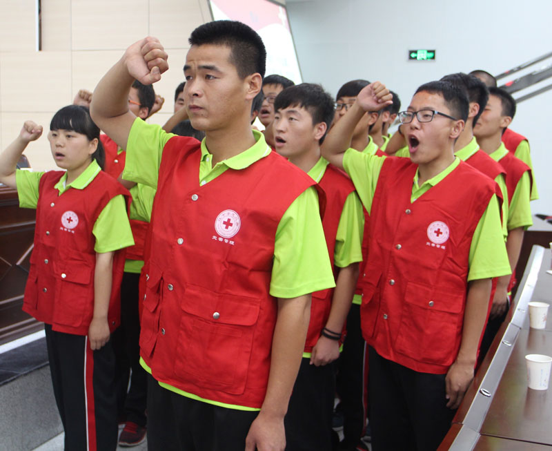 渭南市红十字会秘书长杨和平宣读了《渭南市红十字会关于同意成立陕西铁路工程职业技术学院红十字志愿者服务队的批复》,向学院红十字志愿者服务队授旗,并向首批注册的23名红十字志愿者颁发了中国红十字会志愿者证书,首批获得证书的志愿者进行了宣誓。