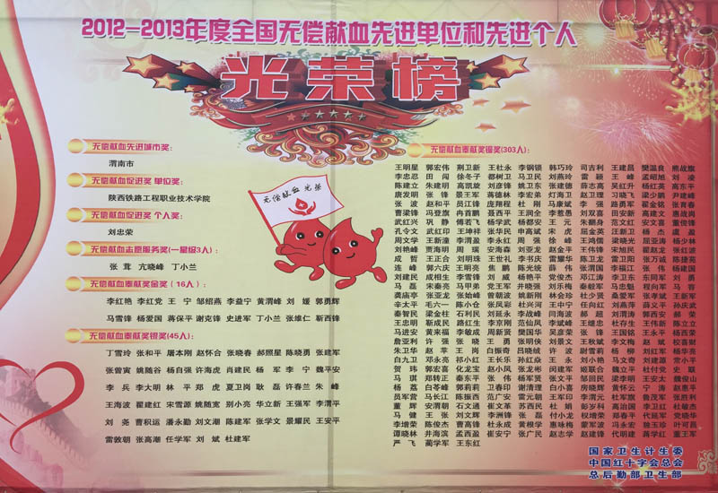 近日,在国家卫生计生委、中国红十字会总会、总后勤部卫生部《关于表彰2012-2013年度无偿献血奉献奖金奖等奖项获奖者的决定》(国卫医发[2015]51号)中,学院被授予“全国无偿献血促进奖”称号。6月14日,院团委组织志愿者参加了渭南市庆祝第十二个“6•14世界献血日”暨2012—2013年度全国无偿献血获奖者表彰活动。