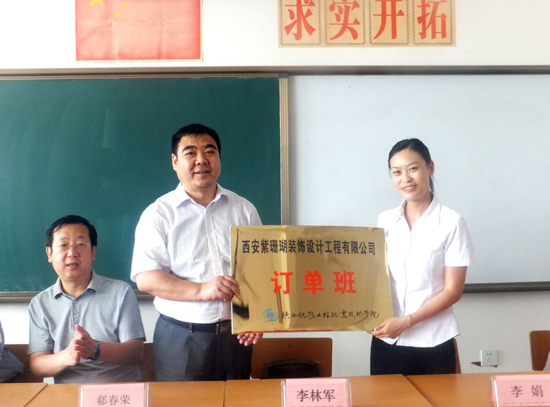 6月10日上午,订单班在高新校区GB502举行开班仪式,学院副院长李林军与紫珊瑚装饰公司人事部经理李娟共同为订单班揭牌。李林军勉励大家一定要坚定专业方向,端正就业观念,到专业对口的企业中,珍惜培训机会,努力学习,认真工作,用优异的成绩回报学院和企业的培养。