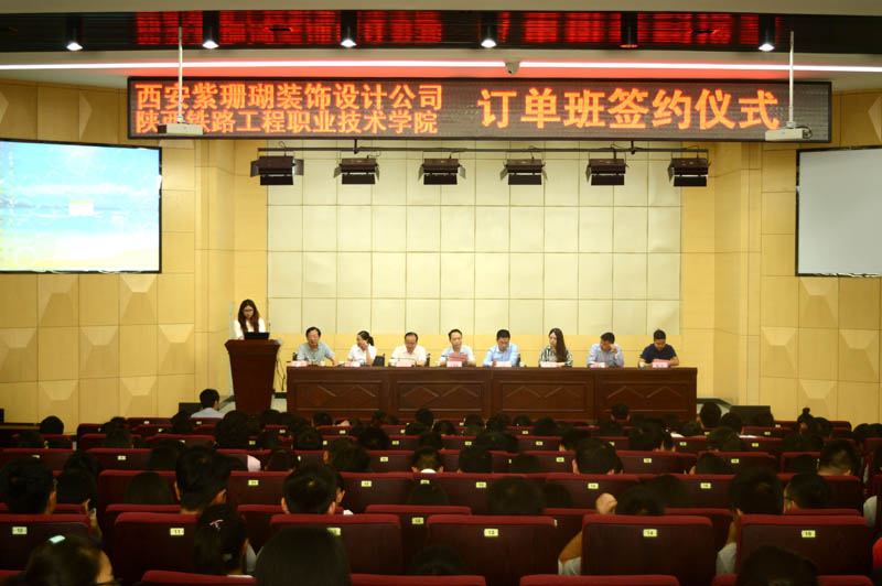 6月9日上午,西安紫珊瑚装饰设计工程有限公司订单班签约仪式在高新校区博爱厅隆重举行,学院党委副书记车绪武、校企合作处处长,紫珊瑚装饰公司运营总监鲁诚之、人事部经理李娟一行七人出席会议,学院建筑工程系系负责人和16届毕业生参加会议。会议由建筑工程系书记主持。会上,车绪武代表学院与紫珊瑚装饰公司运营总监鲁诚之签订了订单培养协议并讲话。他强调此订单班是紫珊瑚装饰公司与学院首次合作项目,希望校企双方优中选优,切实保证订单班学员的质量,充分发挥双方优势,真正实现“合作办学、共同育人、订单就业、协调发展”的目标。