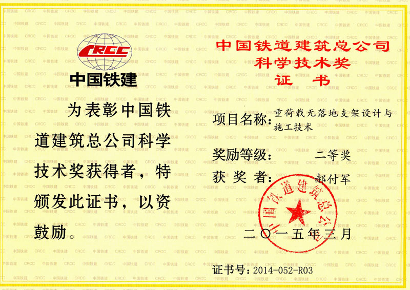 近日,学院铁道工程系教师郝付军参与完成的《重荷载无落地支架设计与施工技术》课题获中国铁道建筑总公司科学技术奖二等奖。