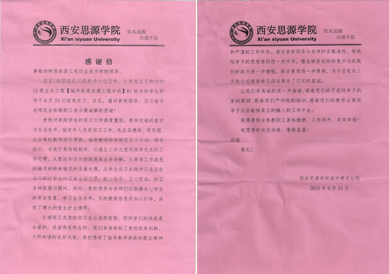 近日,西安思源学院城市建设分院向学院发来感谢信,感谢学院为该院54名本科生提供的良好实践教学条件,和实习期间指导教师全方位的悉心指导。
