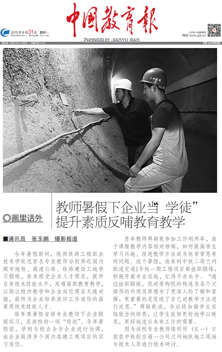 8月31日,《中国教育报》第7版,以“教师暑假下企业当‘学徒’ 提升素质反哺教育教学”为题,对陕西铁路工程职业技术学院专业教师暑期下企业锻炼实践的消息进行了专题报道,现将全文转载如下: