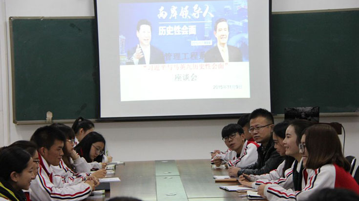 ——管理系师生座谈“习马历史性会谈”。11月9日晚,管理工程系在临渭校区S206商务谈判室召开了“习近平总书记与马英九历史性会面”座谈会,参加本次会议的有管理工程系团总支书记、辅导员及35位党员发展对象。