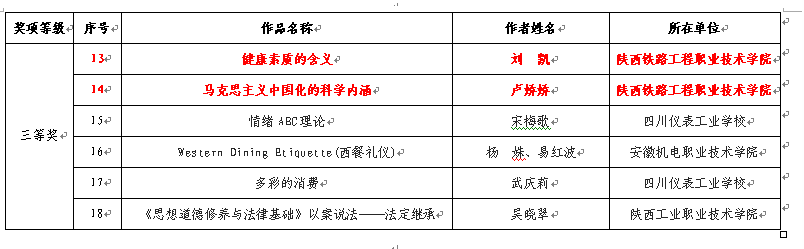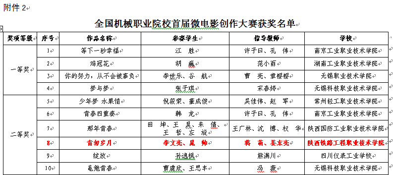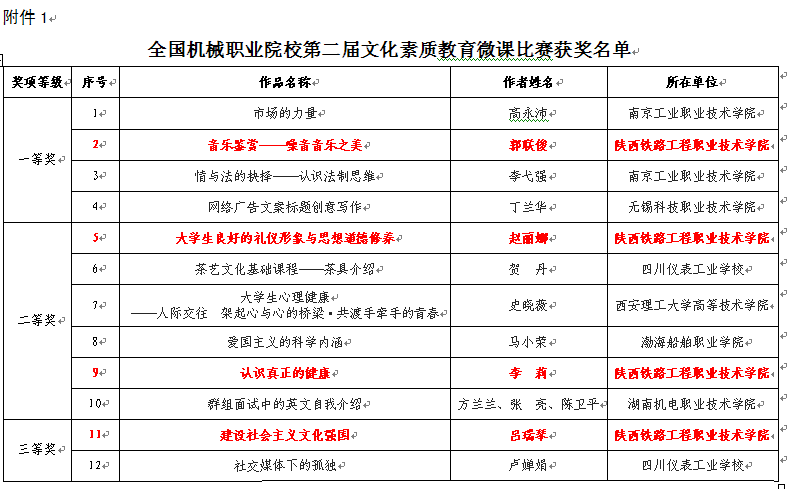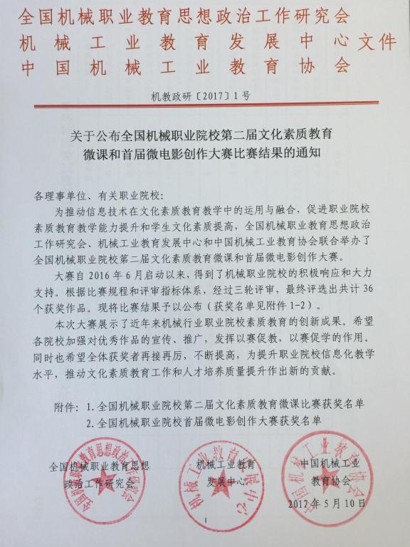 5月10日,全国机械职业教育思想政治工作研究会、机械工业教育发展中心、中国机械工业教育协会发布了《关于公布全国机械职业院校第二届文化素质教育微课和首届微电影创作大赛比赛结果的通知》(机教政研〔2017〕1号),陕铁院荣获一等奖一项、二等奖两项、三等奖三项和微电影创作二等奖一部等多项奖励。