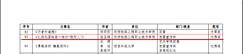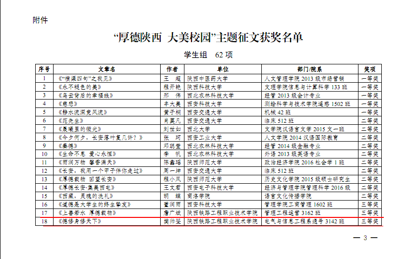 学院党委宣传部蒋萌获“优秀联络站站长”,勤工助学学生通号3155班孙云飞、隧道3153班王万森获“优秀通讯员”称号。同时,学院通号3142班樊帅旻的《德修身 修天下》、运营3162班詹广斌的《上善若水 厚德载物》、工程测量3161班张茳伟《自强不息,厚德载物》获得“厚德陕西 大美校园”征文学生组,学院教师张玉鹏的《扎根祖国铁路一线的“隐形人”》和陈莎莎的《师者的道德》获得教师组征文优秀奖。学院获“优秀组织奖”。