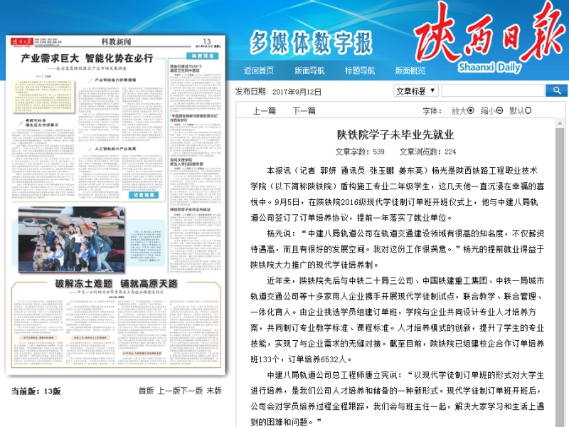 《陕西日报》对“陕铁院学子未毕业先就业”进行报道