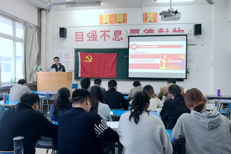 曹喜龙主要从十九大的基本情况,十九大召开的背景,十九大重要内容的学习、十九大召开的重要意义等方面宣讲十九大精神。结合国家人民实际生活发生的翻天覆地的变化以及个人的人生体会,他谈到中国共产党人的初心就是为实现共产主义这个远大理想,再次坚定党员们的理想信念。回顾中国共产党员的发展史,增强党员们对党的全面深刻的认识。同时要求师生党员进一步深刻理解十九大报告的内涵,同时能够将十九大会议精神贯彻在日常的工作和学习中。(黄显鸽、段宝华)