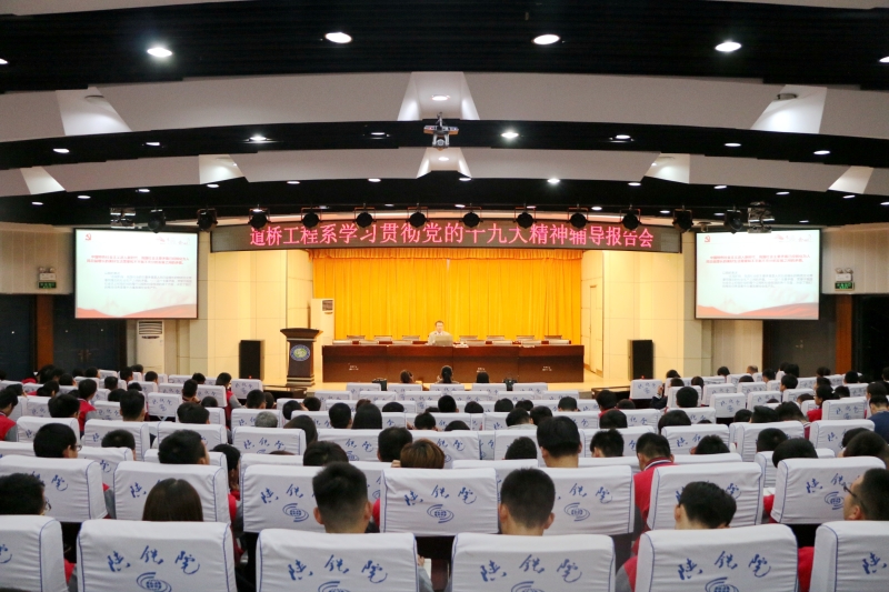 10月24日下午,道桥系党总支在临渭校区学术报告厅召开学习贯彻党的十九大精神辅导报告会,全体教师和部分学生代表等300余人参加报告会,集体学习十九大精神。