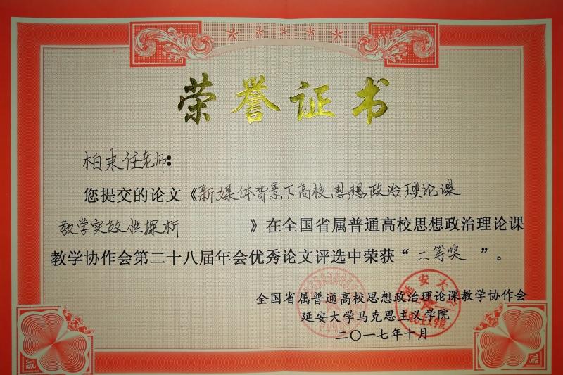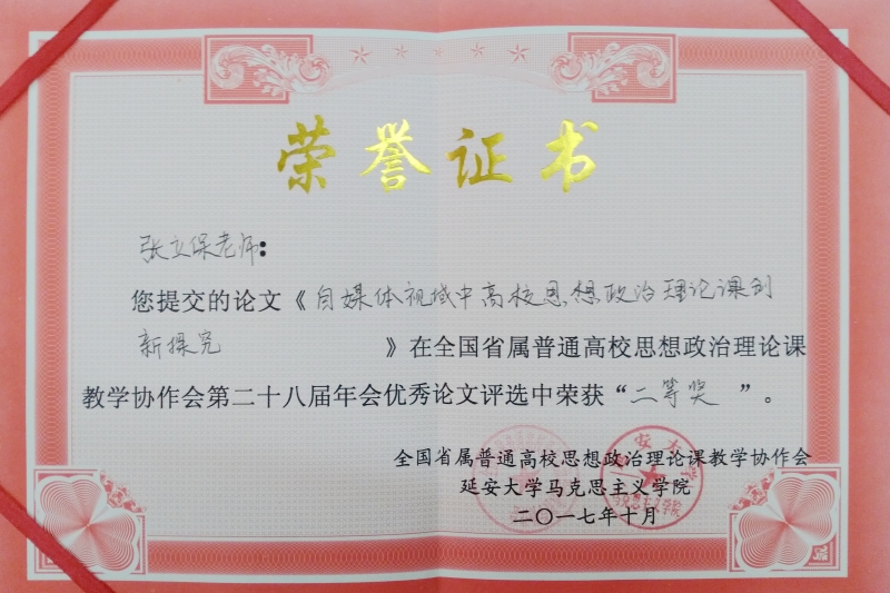 近日,学院思政部张立保老师撰写的《自媒体视域中高校思想政治理论课创新探究》,柏来任老师撰写的《新媒体背景下高校思想政治理论课教学实效性探析》两篇论文在全国省属普通高校思想政治理论课教学协作会第28届会年优秀论文评选活动中荣获二等奖。