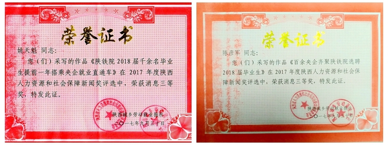 近日,2017年陕西省人力资源和社会保障好新闻奖评选活动揭晓。由学院教师陈彦军、姚天魁采写的作品《百余央企齐聚陕铁院选聘2018届毕业生》荣获消息类三等奖。