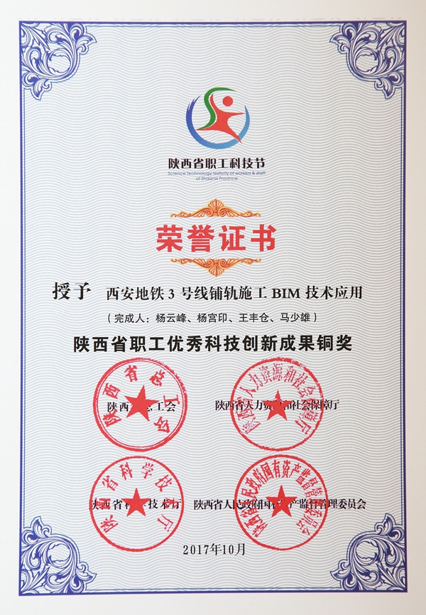 日前,陕西省总工会、陕西省科学技术厅、陕西省人力资源和社会保障厅、陕西省人民政府国有资产监督管理委员会联合下发了“关于表彰陕西省第四届职工科技节优秀项目和先进个人的决定”(陕工发【2017】12号),对省内数个项目授予陕西省职工优秀科技创新成果金奖、银奖、铜奖。学院以杨云峰为组长,杨宫印、王丰仓、马少雄为成员的课题组上报的“西安地铁3号线铺轨施工BIM技术应用”项目,被授予“陕西省职工优秀科技创新成果铜奖”并颁发证书。(王秦平)