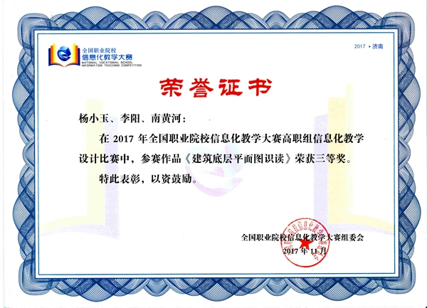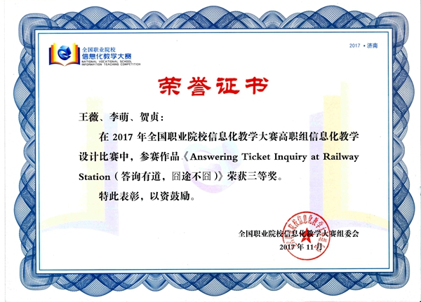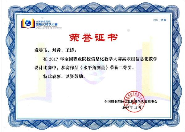 11月27日,从山东济南传来喜讯,在该地举办的2017年全国职业院校信息化教学比赛中,学院推荐的三部信息化教学设计作品全部获奖。其中,袁曼飞、刘舜、王涛团队负责的《水平角测量》项目获二等奖,王薇、李萌、贺贞团队负责的《Answering Ticket Inquiry at Railway Station》和杨小玉、李阳、南黄河团队负责的《建筑底层平面图识读》项目获三等奖。