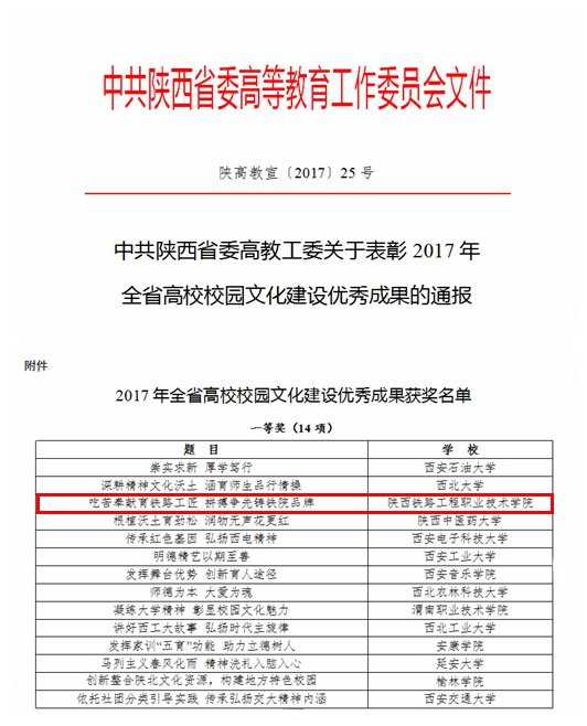 学院《吃苦奉献育铁路工匠 拼搏争先铸铁院品牌》校园文化成果荣获全省高校一等奖,9年 7次捧回该奖项。