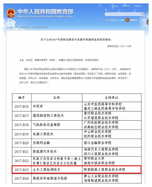 土木工程检测技术专业资源库入选教育部职业教育专业教学资源备选库,高速铁道工程技术专业入选全国职业院校交通运输大类示范专业点。物流管理、铁道通信信号两个省级专综改革试点项目均以“优秀”等次通过验收。新增全省高校创新创业教育改革试点系建设单位1个。《学院内部质量保证体系建设与运行实施方案》经全国诊改专委会审核通过并公布。