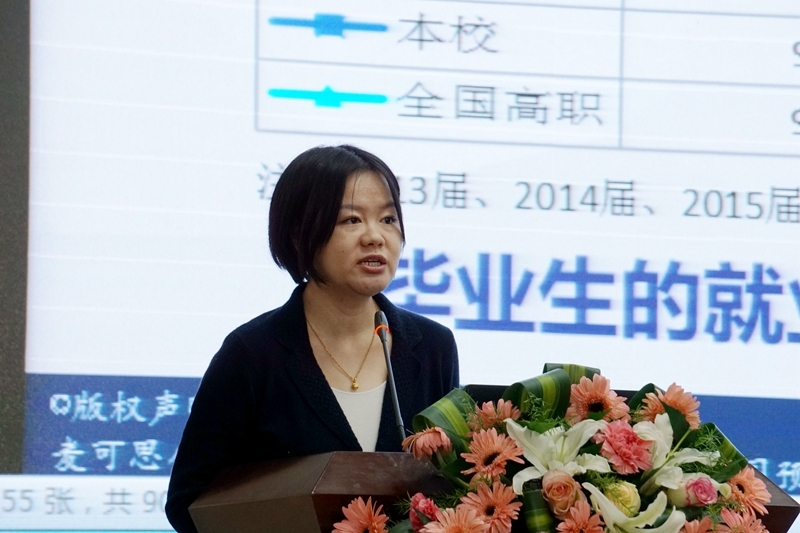 马妍从第三方评价角度发布了学院应届毕业生培养质量评价报告,并介绍了近年来全国高职院校毕业生就业态势与学院毕业生就业水准。她指出,学院2017届毕业生就业率稳中有进,应届毕业生月收入达到4350元,高出同类院校水平751元,起薪再创新高,初次就业率达到97.06%,持续增长,较全国高职院校水平优势明显。