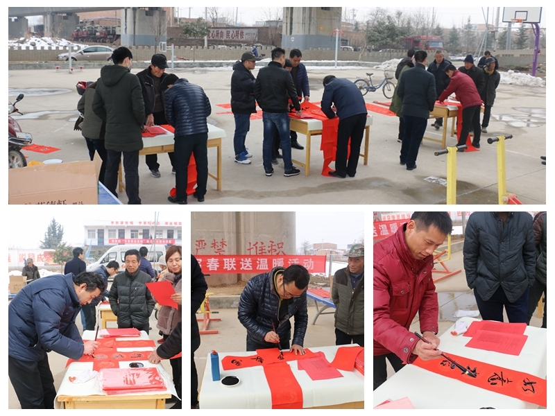 同时,学院多名爱好书法的教师走进张西村、阳郭镇开展了“精准扶贫送温暖·义写春联下基层”的送春联活动,他们在严寒的户外为乡亲们书写了2300多幅春联。 在精准扶贫工作如火如荼进行的过程中,一幅幅春联,书写了吉祥的话语,送出了温暖,传递的是学院对张西村、阳郭镇人民美好的生活祝福,写出了广大村民对美好生活的憧憬和向往,也描绘了大家对脱贫致富坚定信念,乡亲们纷纷称赞学院让大家赶了一次文化大集。