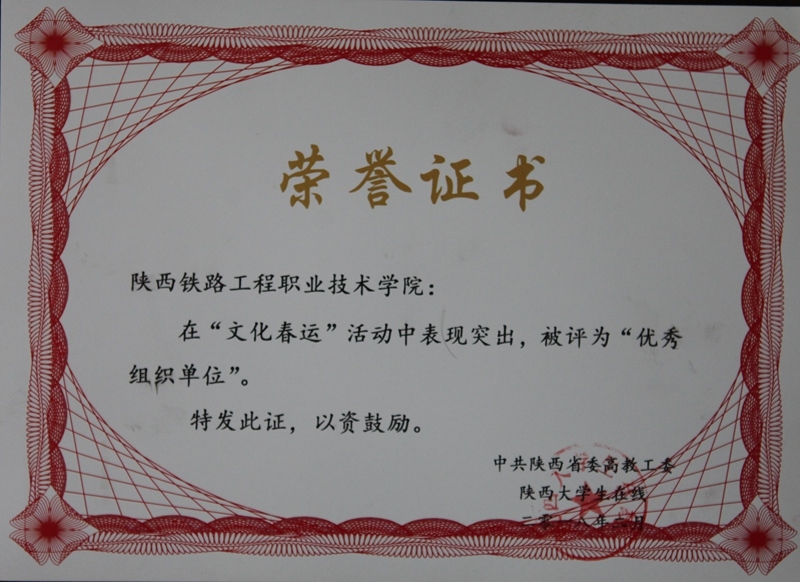 近日,陕西省委高教工委和陕西大学生在线对在2018年陕西青年志愿者助力“文化春运”活动中表现优秀单位及个人进行了表彰,学院荣获“优秀组织单位”,机械3162班尤艇、通号3154班雷哓熙及机电5141班张腾丹等同学荣获“优秀志愿者”称号,党委宣传部姜东亮老师荣获“优秀指导教师”。