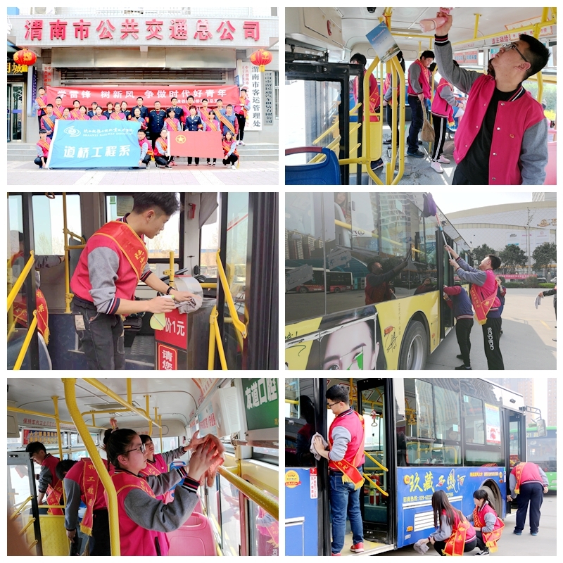 3月15日下午,道桥工程系团总支组织20余名团学干部利用课余时间来到渭南市公共交通总公司与工作人员一道,为我市部分线路的公交车进行清洁消毒工作。建设美丽渭南,为广大市民的出行营造出良好的乘车环境。