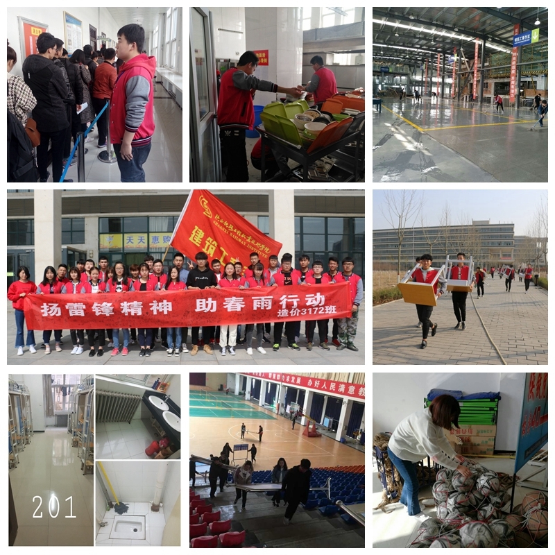 近日,建筑系组织开展了学雷锋主题系列活动,系部各班级、党员、积极分子及志愿者积极参与到各项活动中。3月6日,建筑系各班级组织开展了“晒一晒”活动,各班级通过晒内务、晒班风、晒风貌,充分展示班级和个人良好的形象和面貌,教育引导学生学雷锋先从小事做起,从自身做起;3月8日,40余名党员、积极分子义务打扫实训基地,用崭新的面貌迎接新学期;3月9日,60余名志愿者志愿服务学院2018年单独考试现场确认工作,志愿者义务打扫布置文体中心技能测试考场,在考生确认现场维持秩序,确保确认工作有序顺利进行;3月13日,学生用废PVC板手工制作卡通迷你垃圾桶,装饰校园服务广大师生,让体育场垃圾塑料瓶有了新归宿,成为运动场一道靓丽的风景线;3月14日,12名学生干部协助体育场管理员打扫整理田径场器材室;3月15日,50名志愿者在餐厅当保洁员义务清理餐盘剩饭,清洗餐具,服务广大师生,该志愿者还倡导广大师生打造一个整洁卫生、环境优美、健康文明的校园,让雷锋精神在校园闪光。