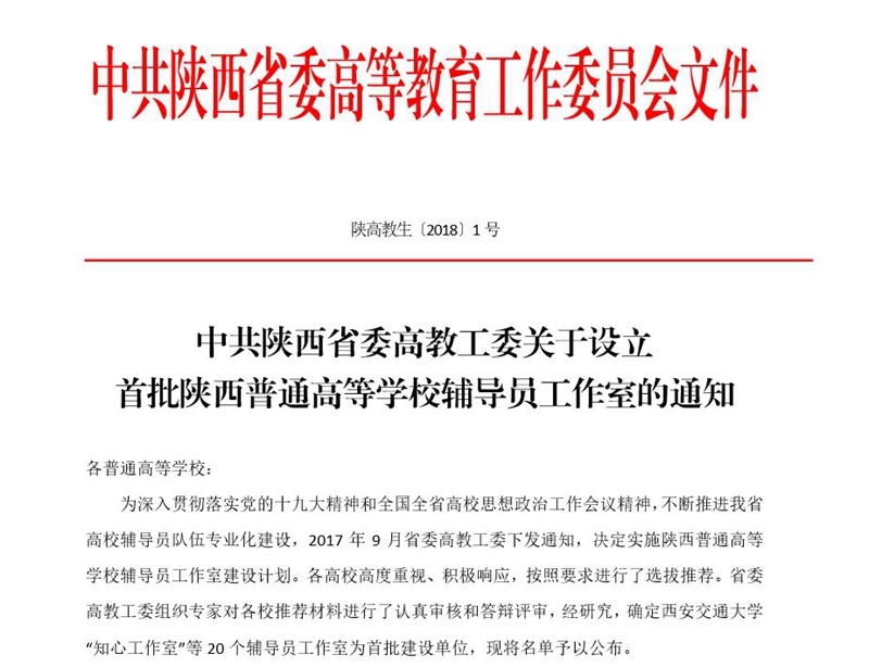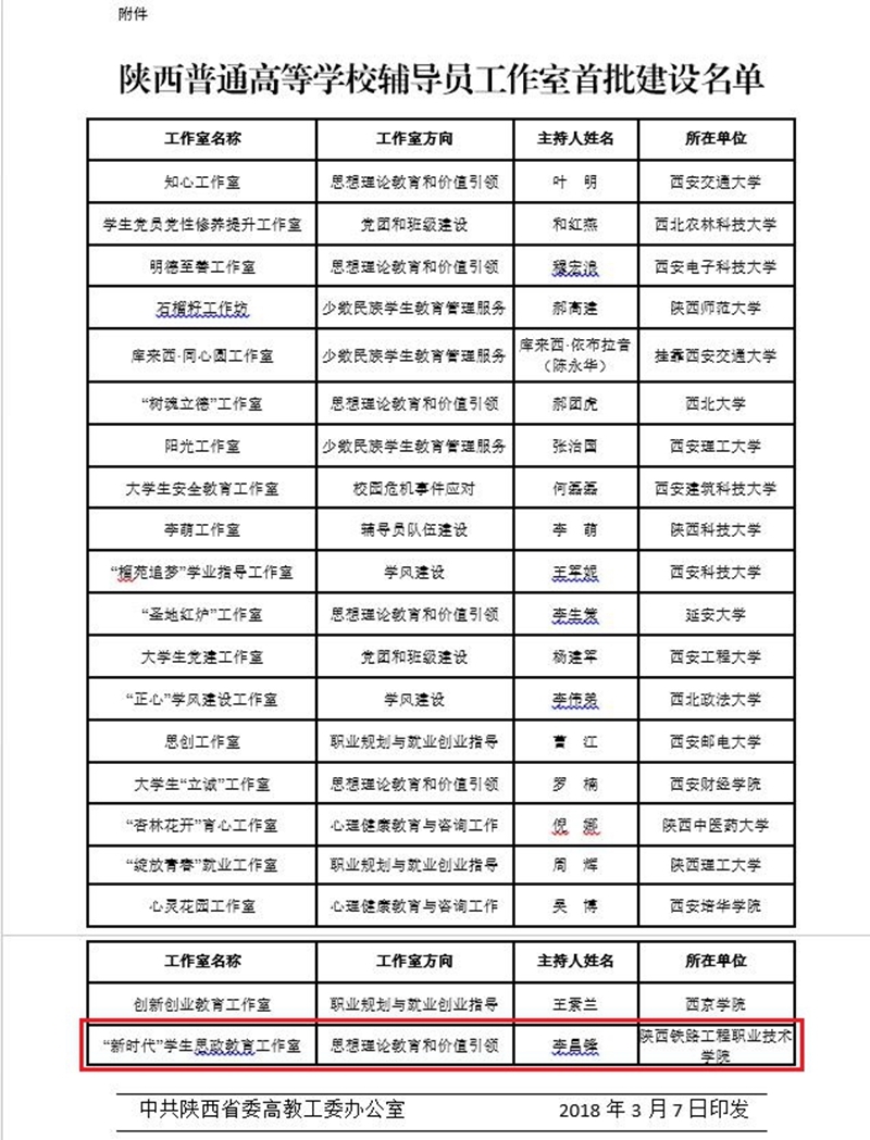 日前,陕西省委高教工委下发《中共陕西省委高教工委关于设立首批陕西普通高等学校辅导员工作室的通知》(陕高教生〔2018〕1号),对陕西普通高等学校辅导员工作室首批建设名单进行了公布,学院李昌锋老师主持的《“新时代”学生思政教育工作室》为陕西省普通高等学校辅导员工作室高职唯一建设项目。