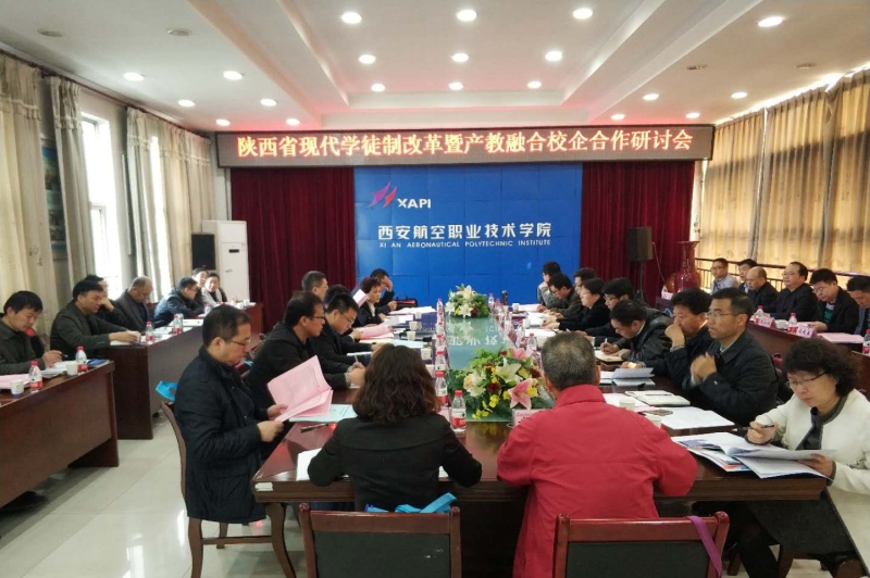 为深入推进现代学徒制改革国家试点工作进展,研究落实国家关于产教融合、校企合作的有关部署,3月21日,陕西省教育厅召集陕西铁路工程职业技术学院(以下简称“学院”)等12所高职院校齐聚西安航空职业技术学院(以下简称“西航院”)举行现代学徒制暨产教融合校企合作研讨会。