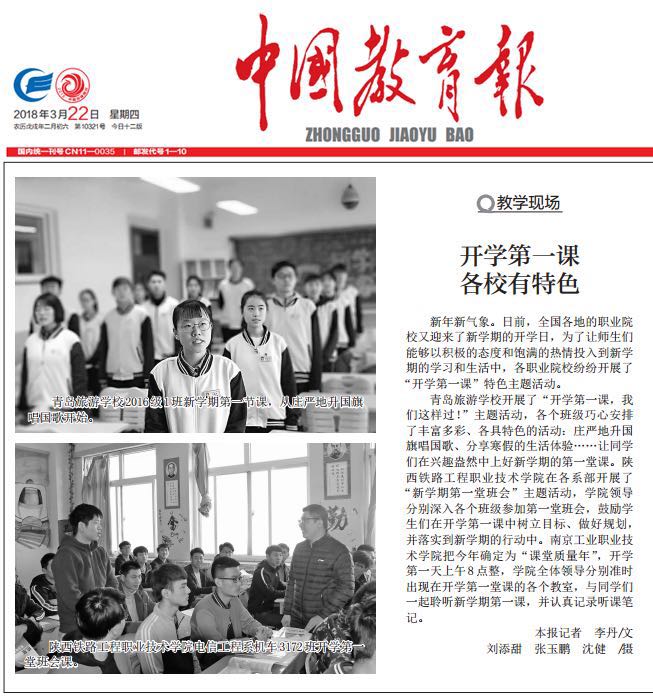 青岛旅游学校开展了“开学第一课,我们这样过!”主题活动,各个班级巧心安排了丰富多彩、各具特色的活动:庄严地升国旗唱国歌、分享寒假的生活体验……让同学们在兴趣盎然中上好新学期的第一堂课。陕西铁路工程职业技术学院在各系部开展了“新学期第一堂班会”主题活动,学院领导分别深入各个班级参加第一堂班会,鼓励学生们在开学第一课中树立目标、做好规划,并落实到新学期的行动中。南京工业职业技术学院把今年确定为“课堂质量年”,开学第一天上午8点整,学院全体领导分别准时出现在开学第一堂课的各个教室,与同学们一起聆听新学期第一课,并认真记录听课笔记。