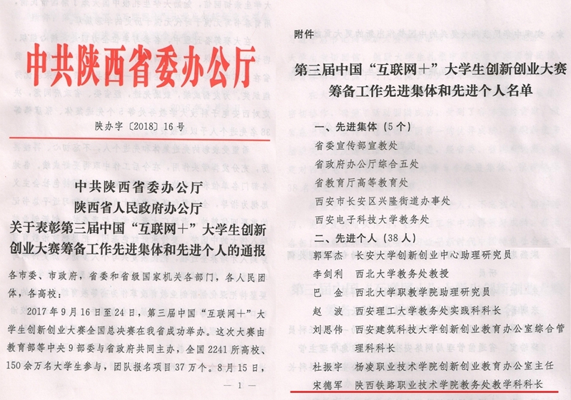 近日,省委办公厅下发《关于表彰第三届中国“互联网+”大学生创新创业大赛筹备工作先进集体和先进个人的通报》(陕办字〔2018〕16号)文件,对第三届中国“互联网+”大学生创新创业大赛筹备工作先进集体和先进个人进行了表彰,学院教务处宋德军同志被评为第三届“互联网+”大学生创新创业大赛筹备工作先进个人。此次在全省范围内共评选出了5个先进集体和38名先进个人,高职院校仅2人。(刘继)