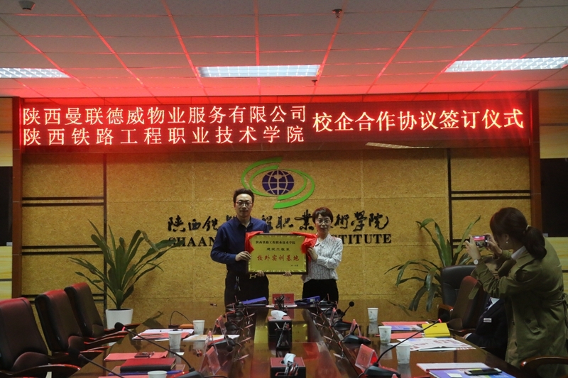 为进一步深化校企合作,实现校企双方资源共享、协同发展和企业、学校、学生的多方共赢,4月25日下午,学院在高新校区行政楼南三楼会议室与陕西曼联德威物业有限公司举行了校外实训基地授牌仪式,陕西曼联德威物业有限公司总经理宋新芳、建筑工程系主任祝和意及校企双方相关人员参加了会议。