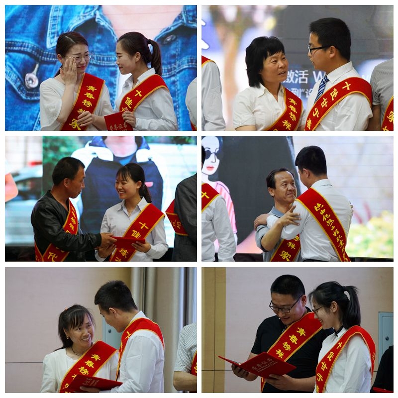 “五类十佳”青春榜样颁奖环节将整个颁奖典礼推向高潮,很多家长走上主席台热情拥抱孩子,热泪盈眶,场面感染了在场的每一位师生。陕西省参加共青团十八次全国代表大会代表候选人、学院优秀共青团员、十佳甘于奉献青春榜样高铁3162班刘涛同学和青春榜样学生家长代表分别发言,分别表达了对学院的感谢和对在场青年学子深深的厚望。