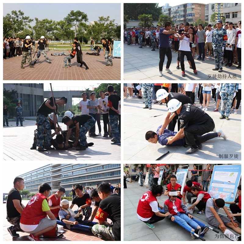 应急演练由“天灾”和“人祸”两部分组成。“天灾”模拟的是地震来袭时,正在上课的学生运用所学的地震应急避险知识进行自我保护,随后在相关人员的引导下迅速撤离至指定位置。整个疏散过程快速、安全、有序,相关人员各就各位,各司其职,学生避险动作准确、熟练、到位。“人祸”模拟的是校外两名恐怖分子手持凶器冲进校园,对手无寸铁的师生进行疯狂砍杀,安保处干事和护校队员挺身而出利用防暴器材协力制服歹徒。反恐演练参演人员倾亲演出,动作逼真,场面震撼,堪比动作大片,赢得了师生热烈的掌声。