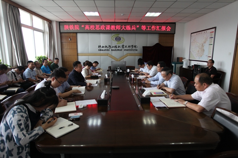在陕铁院思政课教师大练兵活动汇报会上,王晖书记从五个方面做了工作汇报。一是介绍了陕铁院思政课教师大练兵主题活动实施情况及思政课教师队伍建设情况。二是从意识形态责任制实施细则,网络信息安全领导小组及网络阵地建设与管理等方面详细阐述了学院党委意识形态责任制落实情况。三是总结了学院、系部领导听思政课制度落实情况。四是汇报了2018年学院党委理论学习中心组的学习开展情况。五是从稳定安全工作领导小组、心理健康教育中心及地震反恐演练等方面介绍了学院的稳定安全工作情况。期间,新时代辅导员工作室负责人李昌锋表示,通过思政课教师大练兵活动,深深感受到了省委高教工委、学院对思政课的重视,对思政教师的重视,以及对大学生思想政治教育工作的重视。思政课教学能手刘娜说到,教研室集体备课,研读、查阅文献,能够切实推进习近平新时代中国特色社会主义思想“三进”工作。