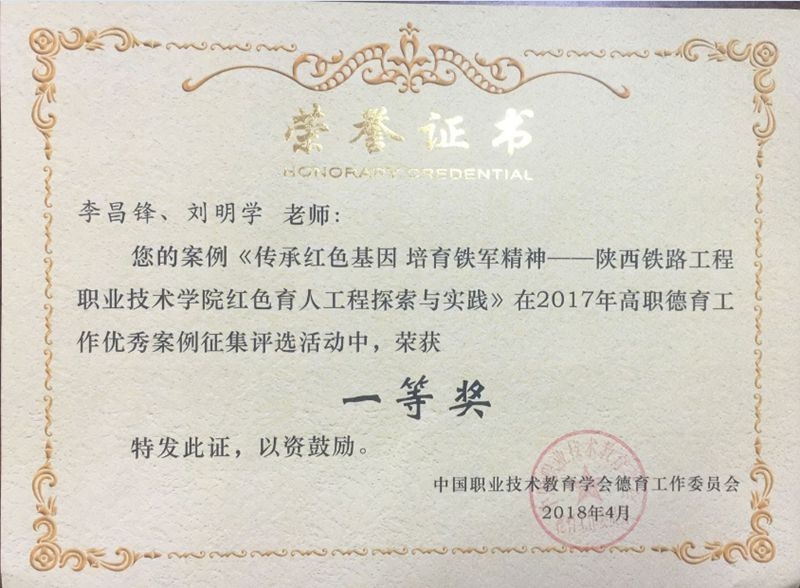由中国职业技术教育学会德育工作委员会组织的“2017年高职德育工作优秀案例征集评选”活动结果日前揭晓,学院道桥工程系李昌峰、刘明学两位老师的案例《传承红色基因培育铁军精神—陕西铁路工程职业技术学院红色育人工程探索与实践》在评选活动中荣获“一等奖”。(汪琦)