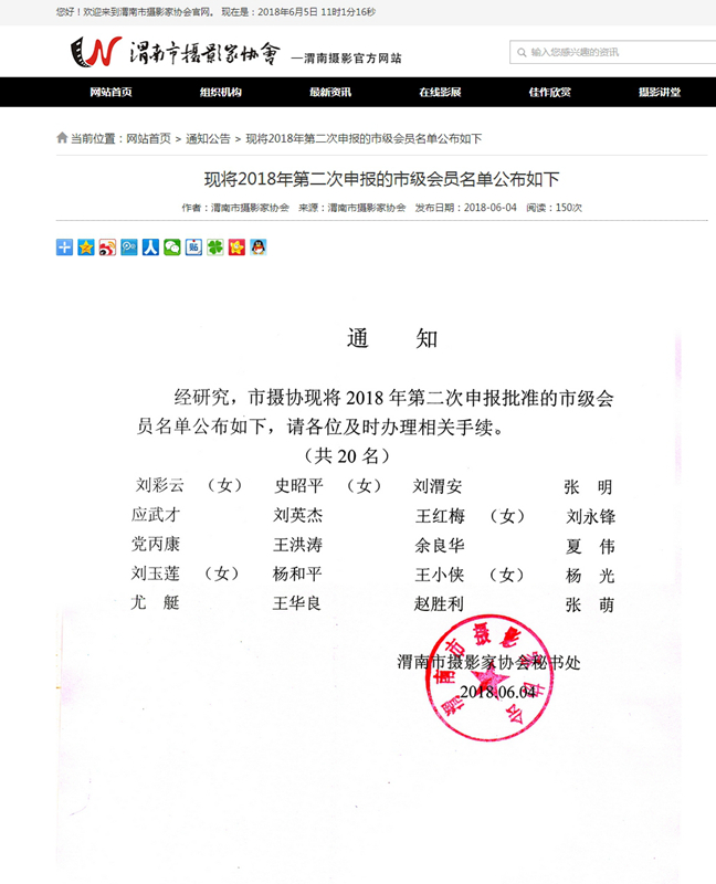 6月4日,渭南市摄影家协会公布了2018年市级会员名单,20人被批准成为渭南市摄影家协会会员。其中学院党委宣传部、艺术教育中心教师杨光,学院机械3162班学生尤艇同批入会。