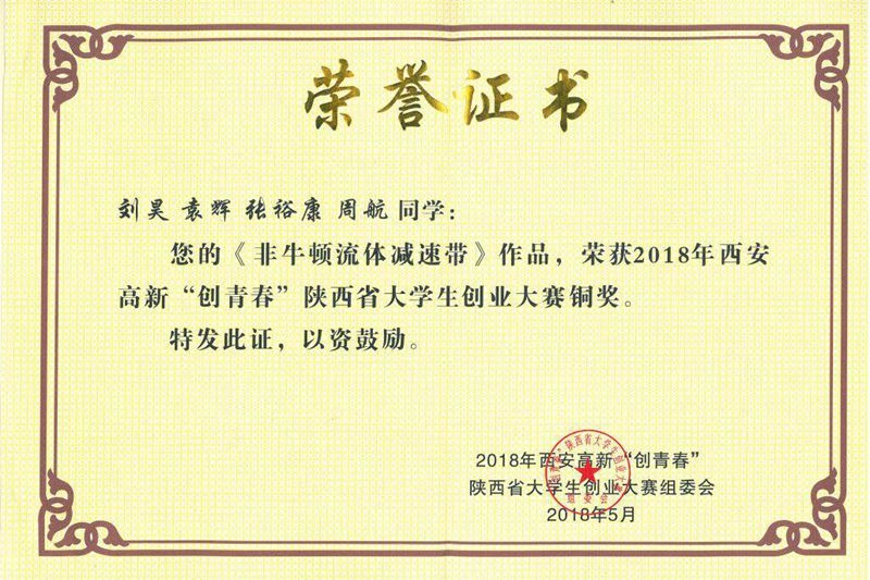 近日,由共青团陕西省委、中共陕西省委高教工委、陕西省教育厅、陕西省科协、陕西省社科联、西安高新区管委会、陕西省学联主办的2018年西安高新“创青春”陕西省大学生创业大赛在西安建筑科技大学落下帷幕。学院选送的作品《非牛顿流体减速带》荣获铜奖。