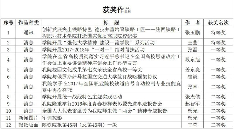 本次评选中,张玉鹏采写的《创新发展突出铁路特色 德技并重培育铁路工匠——陕西铁路工程职业技术学院打造国家优质高职院校纪实》获通讯类特等奖;王莹采写的《学院开展“强化大学精神 建设一流学院”系列活动》获消息类特等奖;张磊采写的《学院开展2017-2018年“一对一”结对帮扶活动》、段东旭采写的《学院在全省高校贯彻落实习近平总书记在全国高校思想政治工作会议上重要讲话精神座谈会上作典型发言》、姜东亮采写的《我院校园文化成果第七次荣获全省高校一等奖》分别获得消息类一等奖;崔巍采写的《学院与俄罗斯萨马拉国立交通大学签订战略框架协议》、张幸采写的《我院学子在2017年全国职业院校铁道信号自动控制专业技能竞赛中再次夺冠》、张杰侯采写的《学院开展统一战线特色主题实践活动》、赵智军采写的《我院隆重举行2016年度青春榜样表彰暨先进事迹报告会》、杨光采写的《全国人大代表雷温芳为我院师生做“两会”精神专题报告》分别获得消息类二等奖;杨光拍摄的《军训掠影》获得新闻图片类一等奖;王莹排版的陕铁院报第45期(总第46期)一版获得报纸版面类二等奖。