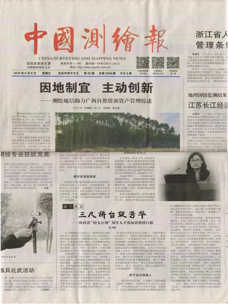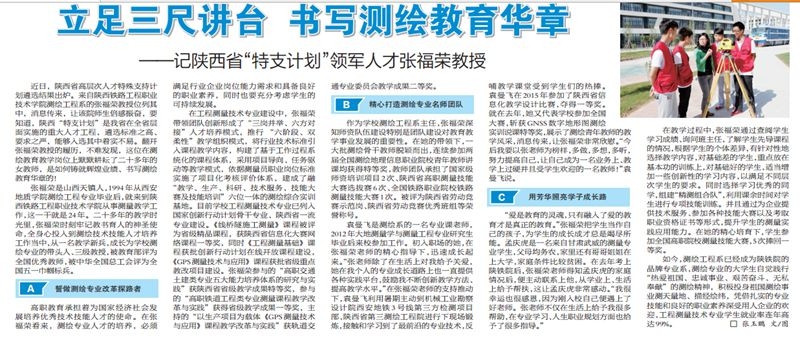 6月8日、14日,《中国测汇报》《陕西工人报》分别以“园丁风采三尺讲台绽芳华”、“立足三尺讲台书写测绘教育华章”为题,相继报道了陕西省“特支计划”领军人才、学院教师张福荣教授。现将全文转载如下:
