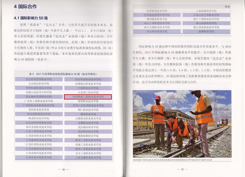 自2012年以来,由全国高职高专校长联席会议委托,上海市教育科学研究院和麦可思研究院共同编制的高职质量年报已经连续发布七年。2018年报告显示,高职院校服务“一带一路”呈现区域特点,开放办学持续深化,境外办学更加多样化。专业教学标准和课程标准逐步得到国(境)外认可,来华留学与培训量增长明显但仍处于起步阶段,亟待高职院校加强专业标准建设,更需要各级政府的政策引导和资源支持。国际影响力50强整体水平提升。