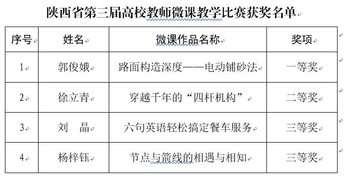 8月29日,陕西省教育厅《关于公布陕西省第三届高校教师微课教学比赛评选结果的通知》(陕教〔2018〕225号)文件公布,学院推荐的5部作品4部获奖,其中一等奖1项,二等奖1项,三等奖2项,同时学院继第二届比赛后再次获得优秀组织奖,学院获奖等次和获奖率居陕西省高职前列。据了解,本届共有全省116所本专科院校的700余件作品参赛,共评出一等奖作品34件、二等奖作品70件、三等奖作品105件、优秀奖作品80件,优秀组织奖获奖单位21个。