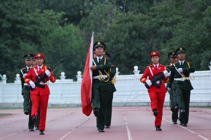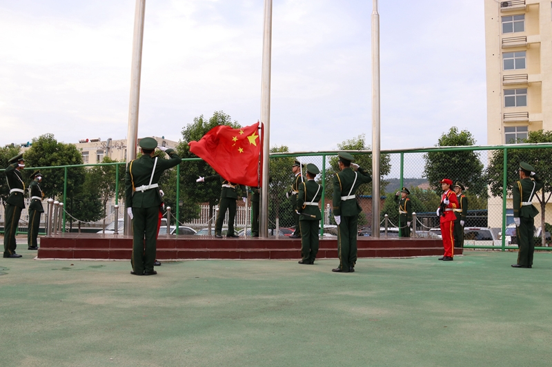 早上7:00,升旗仪式正式开始,国旗仪仗队队员昂首挺胸,迈着铿锵有力的步伐,护卫着神圣的国旗,全体人员庄严肃立,注视着鲜红的五星红旗冉冉升起,嘹亮的国歌在校园内飘荡,爱国爱校、奋发图强的情感在每个人心中激荡。