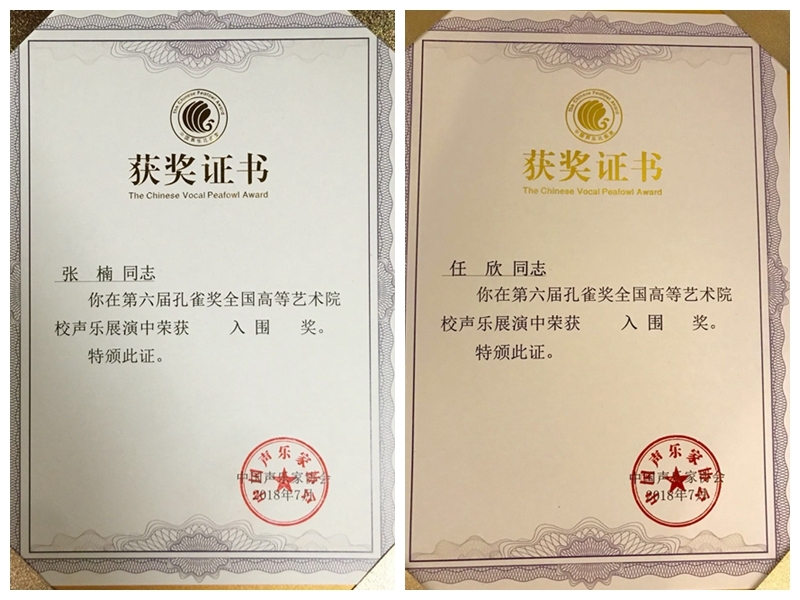 2018年7月20日至27日,第六届“孔雀奖”全国高等艺术院校声乐大赛在广州隆重举行,本次大赛参赛单位包括各大专业音乐院校在内300余所,参赛选手1800余名。经过初赛、复赛、展演(决赛)三个环节的激烈角逐,我院青年教师张楠和任欣获得“入围奖”。