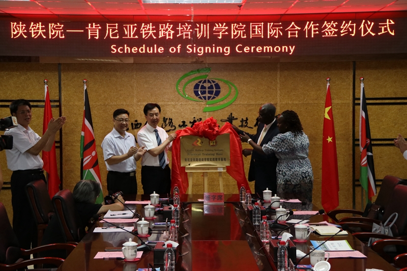 随后,王津、王闯分别与亨利·泰洛、米莉·珂资丽签订了 “陕铁院-肯尼亚铁路培训中心”合作方案暨框架式协议。王津与亨利·泰洛共同为“肯尼亚铁路培训学院实践教学基地”揭牌。