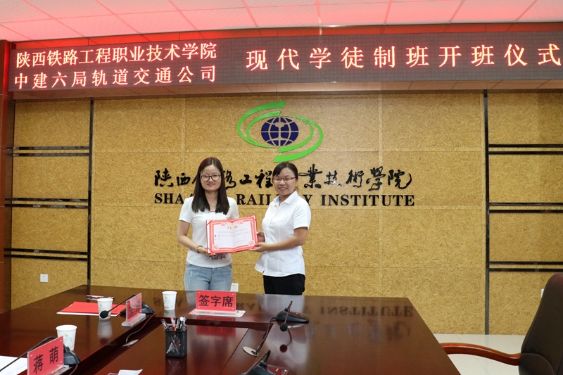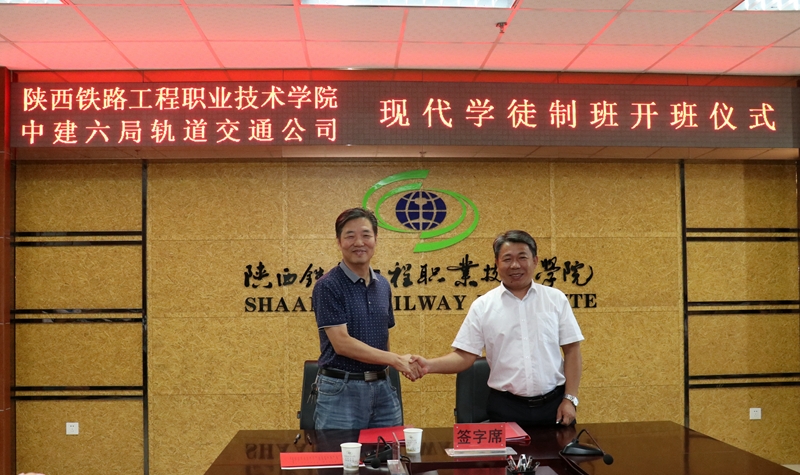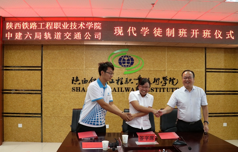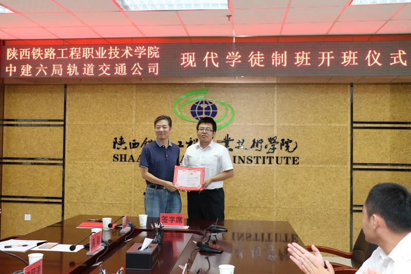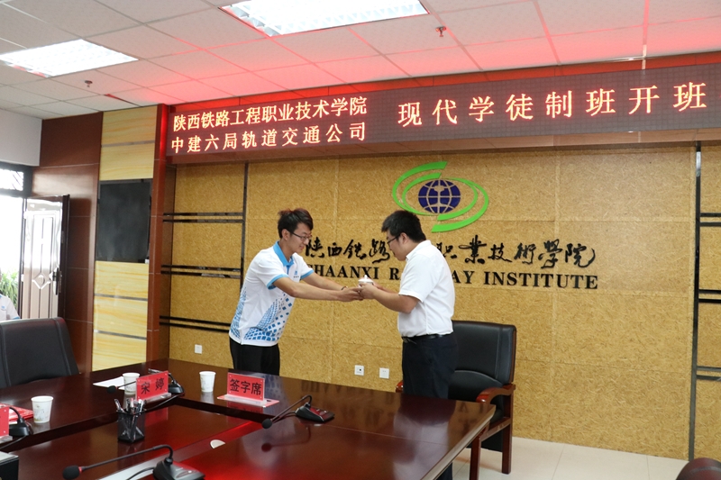 9月11日上午,学院与中建六局轨道公司现代学徒制试点班开班仪式在高新校区南三楼会议室举行。校企双方现场签署了现代学徒制试点班校企合作协议,学徒与学院、企业签订了三方协议,学院为企业导师发放了聘书、企业为学院教师发放校内班主任聘书,并举行了拜师仪式。