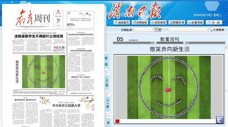 9月19日,《渭南日报》教育周刊以“微笑奔向新生活”为题头版大图刊发了学院2018级新生军训生活的创意照片。该照片来源于学院党委宣传部联合学生处组织策划编发的官微文章《军训特辑丨“最美连队”集结号,见证铁院萌新的创意范!》。该活动历时一周,全校5000余名新生及教官参与,学院新媒体中心学生用无人机为2018级新生组成的32个连队拍摄了创意照片,他们有的站成“花朵”,有的排成“星星”,有的摆成校名简称、45周年校庆、铁路logo等等,充分展现了新生们的青春活动和非凡创意。