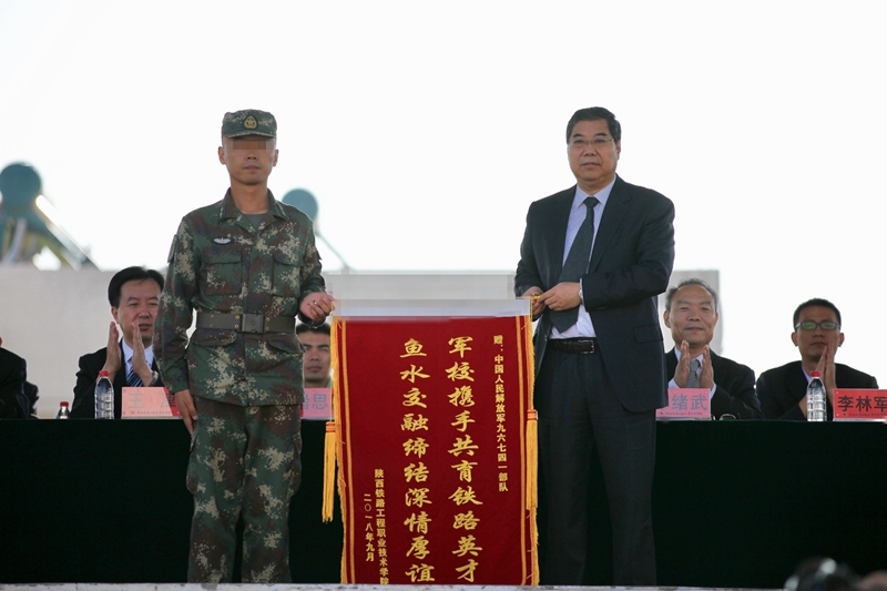 王晖代表学院向承担此次军训任务的中国人民解放军96741部队赠送了锦旗,感谢他们在本次军训活动中付出的辛勤付出。