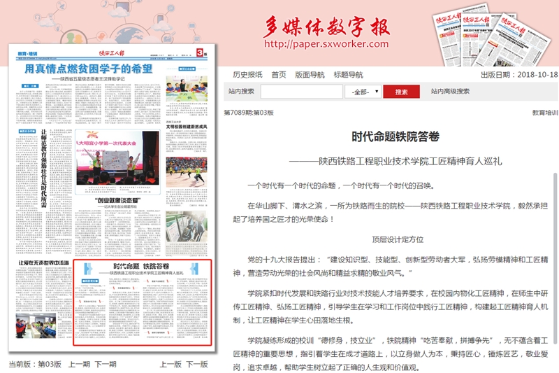2018年10月18日,《陕西工人报》第3版以“时代命题 铁院答卷——陕西铁路工程职业技术学院工匠精神育人巡礼”为题,长篇幅报道学院紧扣时代发展,培育和弘扬工匠精神的育人做法。现将全文转载如下: