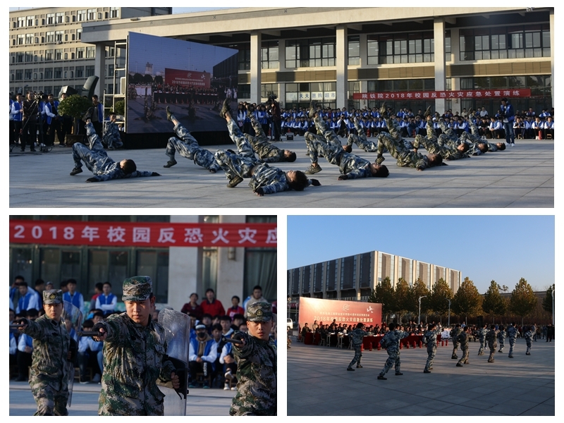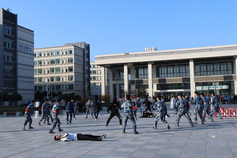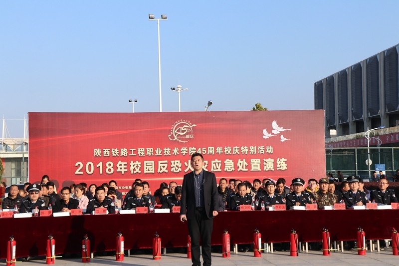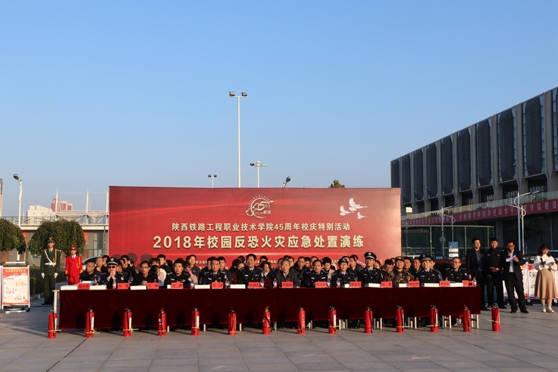 11月8日,学院45周年校庆特别活动——2018年校园反恐火灾应急处置演练在学院高新校区举行。此次演练由渭南市公安局与学院主办,渭南市公安局高新分局、高新消防大队特勤中队、渭南市高新区白杨卫生院、西安景铭保安服务有限公司协办。参与人数达3000人,渭南市公安局、高新区各高校、中小学及幼儿园领导60余人来院观摩。