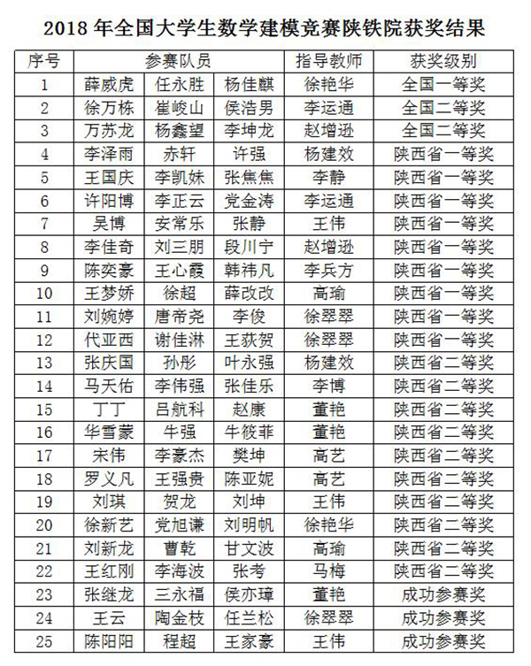 近日,省教育厅公布2018全国大学生数学建模竞赛陕西赛区获奖名单,学院选出的26个队参加了2018年的全国大学生数学建模竞赛,共有25个队获奖,其中获得全国一等奖1项,全国二等奖2项,陕西一等奖9项,陕西二等奖10项,成功参赛奖3项,学院获奖级别创历史新高。
