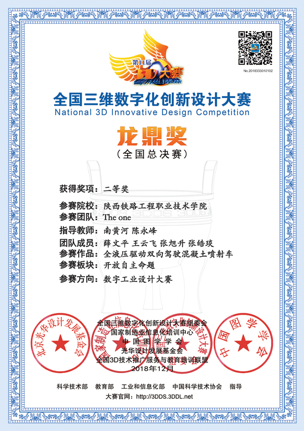 12月6日至9日,第11届全国3D大赛年度总决赛暨2018数字科技文化节在云南省玉溪市举行,由学院教师南黄河、陈永峰指导的,机电工程系学生薛文平、王云飞、张旭升、张皓琰共同创作的作品《全液压驱动双向驾驶混凝土喷射车》喜获二等奖。